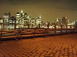 The Brooklyn Heights Promenade, also called the Esplanade,[1] is a 1,826-foot (557 m)-long platform and pedestrian walkway cantilevered over the Brooklyn-Queens Expressway (Interstate 278) in Brooklyn Heights, Brooklyn, New York City, United States. With views of Lower Manhattan's skyline and the New York Harbor, it came about as the byproduct of competing proposals for the highway's route that were resolved in the midst of World War II. Actual construction came after the war. As a structure built over a roadway, the Promenade is owned by the NYCDOT and is not considered a park; however, NYC Parks maintains the entire Promenade.[2]