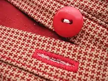 A buttonhole is a reinforced hole in fabric that a button can pass through, allowing one piece of fabric to be secured to another. The raw edges of a buttonhole are usually finished with stitching. This may be done either by hand or by a sewing machine. Some forms of button, such as a frog, use a loop of cloth or rope instead of a buttonhole.[1]