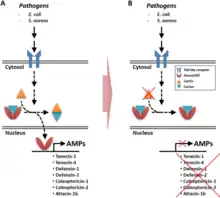 [8] Upon activation of Toll signaling by Gram-positive and Gram-negative bacteria infection, Cactin in the cytosol binds to Cactus and mediates the release of Dif and Dorsal from Cactus, allowing their translocation into the nucleus and activation of AMP genes.