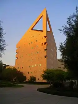 Its pointed, triangular and open top made it the most distinct tower on the university campus. According to Predock, "inevitably, human settlement alters the landscape. Successive habitation has altered the Pomona Valley from the original dry swept earth of Rancho San Jose. Now the verdant Arabian horse ranch of W.K. Kellogg coexists with the technological, superscale freeway interchange."[1] Due to Cal Poly Pomona's proximity to the Los Angeles district of Hollywood, the building has been displayed in films such as Gattaca and Impostor, as well as several TV commercials for products such as cars and cell phones.[3] Cal Poly Pomona changed its logo in 1994 after the opening of the building.[4]