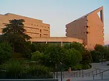 The Classroom, Laboratory & Administration Building, commonly known simply as the CLA Building, was an administrative building on the campus of California State Polytechnic University, Pomona (Cal Poly Pomona). Designed by Albuquerque, New Mexico-based architect Antoine Predock in the Futurist style and completed in 1993, it has come to be the defining image of the university.[1] The Administration portion of the building was demolished in August 2022 after a discovery of a fault line under the building. [2]