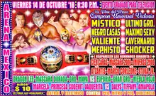 The CMLL Universal Championship (2016) (Spanish: Campeonato Universal) was a professional wrestling tournament produced and scripted by Consejo Mundial de Lucha Libre (CMLL). The tournament took place from October 14, 2016 and ran for three Super Viernes shows with the finals on October 28, 2016. The CMLL Universal Championship is an annual tournament exclusively for wrestlers holding CMLL-recognized champions; first held in 2009, making the 2016 version the eight overall tournament. Being a professional wrestling tournament, it is not won legitimately; it is instead won via predetermined outcomes to the matches that is kept secret from the general public.