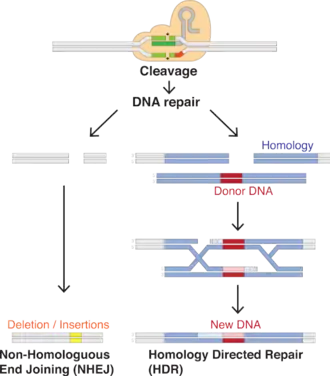 Working like genetic scissors, the Cas9 nuclease opens both strands of the targeted sequence of DNA to introduce the modification by one of two methods. Knock-in mutations, facilitated via homology directed repair (HDR), is the traditional pathway of targeted genomic editing approaches.[1] This allows for the introduction of targeted DNA damage and repair. HDR employs the use of similar DNA sequences to drive the repair of the break via the incorporation of exogenous DNA to function as the repair template.[1] This method relies on the periodic and isolated occurrence of DNA damage at the target site in order for the repair to commence. Knock-out mutations caused by CRISPR-Cas9 result from the repair of the double-stranded break by means of non-homologous end joining (NHEJ) or POLQ/ polymerase theta-mediated end-joining (TMEJ). These end-joining pathways can often result in random deletions or insertions at the repair site, which may disrupt or alter gene functionality. Therefore, genomic engineering by CRISPR-Cas9 gives researchers the ability to generate targeted random gene disruption. Because of this, the precision of genome editing is a great concern. Genomic editing leads to irreversible changes to the genome.