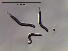 Caenorhabditis angaria is a small nematode, in the same genus as the model organism Caenorhabditis elegans. The name is from the Latin (angarius "mounted courier") after the tendency to ride weevils. Prior to 2011, the species was referred to as C. sp. 2, C. sp. 3, and C. sp. PS1010.[1] Its genome was sequenced at the California Institute of Technology in 2010.[2] This species is gonochoristic. It has distinct morphology and behavior compared to C. elegans; notably, C. angaria males exhibit a spiral mating behavior. Its divergence from C. elegans is similar to the distance between humans and fish. C. castelli is its closest relative, and the two species can produce F1 hybrids.[3]