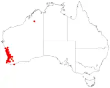 This species of blue tinsel lily is widespread and common within 80 kilometres of the coast on the Swan Coastal Plain and Darling Scarp from Busselton north to Geraldton, in the South West Botanical Province. It usually grows in a wide range of vegetation associations and habitats, including kwongan, woodland on white, grey, or yellow sand, and occasionally in swampy areas.[1]