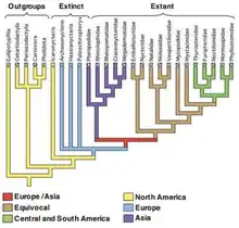 Cladogram showing the relatedness of bats, different colored branches correspond to the species' region.