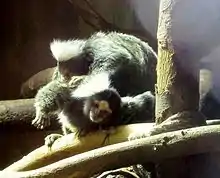 Common marmosets live in stable extended families, with only a few members allowed to breed.[17][18] A marmoset group can contain as many as 15 members, but a more typical number is nine.[16] A marmoset family usually contains one or two breeding females, a breeding male, their offspring, and their adult relatives, be they their parents or siblings.[18] The females in a group tend to be closely related, and males less so. Males do not mate with breeding females to which they are related. Marmosets may leave their natal groups when they become adults, in contrast to other primate species, which leave at adolescence. Not much is known of the reasons marmosets leave their natal groups.[18] Family groups fuse into new groups when a breeding male dies.[19] Within the family groups, the breeding individuals tend to be more dominant. The breeding male and female tend to share dominance. Between two breeding females, though, one is more dominant. In addition, the subordinate female is usually the daughter of the dominant one. For the other members, social rank is based on age.[17] Dominance is maintained though various behaviors, postures, and vocalizations, and subordinates groom their superiors.[17]
