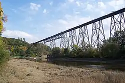 • 4.4 kilometres (2.7 mi) to the south in an urban area, by cutting avenue Blaise-Pascal, rue Provancher, boulevard de la Chaudière, rue Augustin-Bourbeau, the Canadian Pacific Railway bridge and rue Saint-Félix, to its mouth.[7]