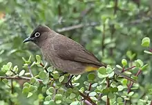 The Cape bulbul is considered to belong to a superspecies along with the Himalayan bulbul, white-eared bulbul, white-spectacled bulbul, African red-eyed bulbul, and the common bulbul.[7] Alternate names for the Cape bulbul include the Cape geelgat and two names used for other species (common and dark-capped bulbul).