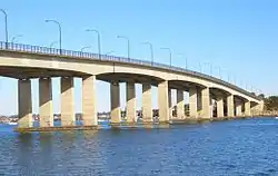 The Captain Cook Bridge is a road bridge that carries Taren Point and Rocky Point Roads across the Georges River in southern Sydney, in the state of New South Wales, Australia. The precast prestressed concrete girder bridge crosses near the river mouth as it empties into Botany Bay; and links the St George and Sutherland areas of Sydney. The bridge comprises a dual carriageway with three lanes in each direction of highway grade-separated conditions; and pedestrian and bicycle traffic, via two grade-separated paths. on the eastern and western sides of the bridge.