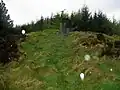 The hill is particularly important for the two possible passage grave structures atop it. The largest example is Cairn A (or Carn Caille), marking the highest physical point of the hill with a diameter of 18 m and height of 3 m. Reference to that cairn does not appear until 1960, when Ordnance Survey Ireland installed a trigonometrical station, partially damaging the cairn. An excavation took place before installation, with cremated bone recovered from a central rectangular chamber. Thanks to the advent of Global Positioning System technology, the trigonometrical station is now redundant. The second cairn, Cairn B, is about 50 m to the north of Cairn A, with a 9 m diameter and difficult to identify due to the extensive coverage of peat and heather.[5]