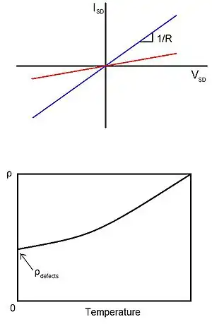 Figure 3: (Top) Simple source-drain voltage sweeps with increasing defect density can be used to extract a carrier scattering rate and dangling bond energy (red curve having more defects). (Bottom) Temperature dependence of resistivity. Near absolute zero, the weight of defects on carrier scattering is revealed.