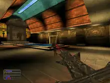 A.S. Berman, in his review for USA Today, reported the game as a satisfying adrenaline rush, and he praised the environments as being "exquisitely rendered".[31] Randy Sluganski of Just Adventure said the graphics were less advanced than peers like Quake and Unreal but praised the use of vibrant colors, dynamic lighting, and volumetric fog.[1] Games Domain's Bruce Pulver criticized the visuals only for often being too dark, such that important elements were not visible.[2] Williamson regarded the lighting as poor overall, oscillating between too dark and "over-saturated disco colors".[28] Liu cited blurry textures, some lackluster animations, and poorly executed illusions for outdoor areas.[29] Ryan Reynolds wrote for the Evansville Courier & Press that the game exhibited some visible shortcomings, such as enemy limbs clipping through walls.[32]