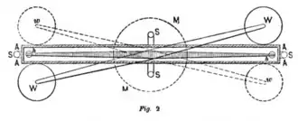 Cavendish's diagram of his torsion pendulum, seen from above. The pendulum consists of two small spherical lead weights (h, h) hanging from a 6-foot horizontal wooden beam supported in the center by a fine torsion wire. The beam is protected from air currents inside a wooden box (A, A, A, A). The two large weights (W, W) attached to a separate suspension attract the small weights, causing the beam to rotate slightly. The rotation is read off of vernier scales (S) at either end of the rod. The large weights can be rotated to the other side of the torsion beam (w, w), causing the beam to rotate in the opposite direction.