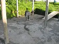 A hand-operated mechanical press creates stabilised bricks. Clay based soil mixed with five percent cement is used to form the base of the bricks.
