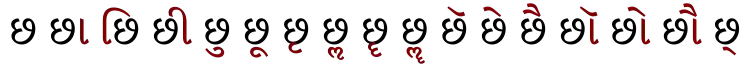 | छ | छा | छि | छी | छु | छू | छृ | छॄ | छॢ | छॣ | छे | छै | छो | छौ | छ् |