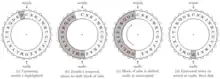 In step (3) slide the eleven letter tabs from zenith+3 until zenith+13 (i.e., 'BQDSEFGHLWI') one position counter-clockwise. This closes up the 'hole' at zenith-2 while opening a new 'hole' at the nadir (Figure 5d).