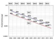 NAND flash has been scaling very aggressively (figure 4). As processes migrate, the width of the interface of the control gate and the floating gate shrinks in proportion to the square of the shrink, and the spacing between floating gates shrinks in proportion to the process shrink, but the floating gate's thickness remains the same (the thinner the floating gate is made the less tolerant the cell becomes to electron loss). This means that the coupling between adjacent floating gates becomes larger than the coupling between the control gate and the floating gate, leading to data corruption between adjacent bits.