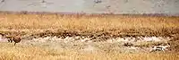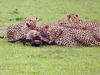 Males are generally less nomadic than females; often males in coalitions (and sometimes solitary males staying far from coalitions) establish territories.[59][62] Whether males settle in territories or disperse over large areas forming home ranges depends primarily on the movements of females. Territoriality is preferred only if females tend to be more sedentary, which is more feasible in areas with plenty of prey. Some males, called floaters, switch between territoriality and nomadism depending on the availability of females.[65] A 1987 study showed territoriality depended on the size and age of males and the membership of the coalition.[111] The ranges of floaters averaged 777 km2 (300 sq mi) in the Serengeti to 1,464 km2 (565 sq mi) in central Namibia. In the Kruger National Park (South Africa) territories were much smaller. A coalition of three males occupied a territory measuring 126 km2 (49 sq mi), and the territory of a solitary male measured 195 km2 (75 sq mi).[65] When a female enters a territory, the males will surround her; if she tries to escape, the males will bite or snap at her. Generally, the female can not escape on her own; the males themselves leave after they lose interest in her. They may smell the spot she was sitting or lying on to determine if she was in oestrus.[110]