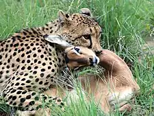 - ↑ Hayward, M. W.; Hofmeyr, M.; O'Brien, S. J. & Kerley, G. I. H. (2006). "Prey preferences of the cheetah (Acinonyx jubatus) (Felidae: Carnivora): morphological limitations or the need to capture rapidly consumable prey before kleptoparasites arrive?". Journal of Zoology. 270 (4): 615–627. doi:10.1111/j.1469-7998.2006.00184.x.