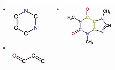 Overlapping substructures of caffeine. Two substructures of a caffeine molecule are given, (A) and (B). The overlap of these substructures is highlighted in green in the caffeine structure (C).