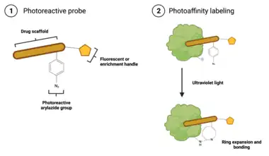 Unlike ABPP, which results in protein labeling upon probe binding, photoaffinity labeling probes require activation by photolysis before covalent bonding to a protein occurs.[7] The presence of a photoreactive group makes this possible.[7] These probes are composed of three connected moieties: (1) a drug scaffold; (2) a photoreactive group, such as an phenylazide, phenyldiazirine, or benzophenone; and (3) an identification tag, such as biotin, a fluorescent dye, or a click chemistry handle.[9] The drug scaffold is typically an analog of a drug whose mechanism is being studied, and, importantly, binds to the target reversibly, which better mimics the interaction between most drugs and their targets.[9] There are several varieties of photoreactive groups, but they are fundamentally different from ABPP probes: while ABPP specifically labels nucleophilic amino acids in a target's active site, photoaffinity labeling is non-specific, and thus is applicable to labeling a wider range of targets.[7] The identification tag will vary depending on the type of analysis being done: biotin and click chemistry handles are suitable for enrichment of labeled proteins prior to mass spectrometry based identification, while fluorescent dyes are used when using a gel-based imaging method, such as SDS-PAGE, to validate interaction with a target.[7][9]