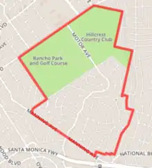 According to the Mapping L.A. project of the Los Angeles Times, Cheviot Hills' street and other borders are Rancho Park Golf Course and Hillcrest Country Club to the northwest; Anchor Avenue and Club Drive to the east; and Manning Avenue to the southwest.[3][4] Using these boundaries, Cheviot Hills is flanked on the north by West Los Angeles and Century City, on the east by Beverlywood and Castle Heights, on the south by Palms, and on the west by Rancho Park.[5]