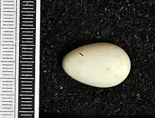 Unlike some swift species, which mate in flight, chimney swifts mate while clinging to a vertical surface near their nest.[58] They copulate daily, until the clutch is complete.[59] The female typically lays 4–5 eggs,[57] though clutch sizes range from 2 to 7.[59] The eggs, which are long and elliptical in shape, are moderately glossy, smooth and white, and measure 20 mm × 13 mm (0.79 in × 0.51 in).[57] Each weighs nearly 10 percent of the female's body weight.[59] Incubated by both parents, the eggs hatch after 19 days. Baby chimney swifts are altricial—naked, blind and helpless when they hatch. Fledglings leave the nest after a month.[57]