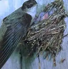 Before the arrival of European colonists into North America, the chimney swift nested in hollow trees; now, it uses human-built structures almost exclusively.[28] While the occasional nest is still built in a hollow tree (or, exceptionally, in an abandoned woodpecker nest),[54] most are now found inside chimneys, with smaller numbers in airshafts, the dark corners of lightly used buildings, cisterns,[55] or wells.[56] The nest is a shallow bracket made of sticks, which the birds gather in flight, breaking them off trees. The sticks are glued together (and the nest to a vertical surface) with copious amounts of the bird's saliva.[57] During the breeding season, each adult's salivary glands more than double in size, from 7 mm × 2 mm (0.276 in × 0.079 in) in the non-breeding season to 14 mm × 5 mm (0.55 in × 0.20 in) during the breeding season.[16]