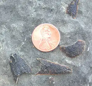 Separate plates from Matthevia, a Late Cambrian polyplacophoran from the Hellnmaria Member of the Notch Peak Limestone, Steamboat Pass, southern House Range, Utah are shown with a US one-cent coin (19 mm in diameter).