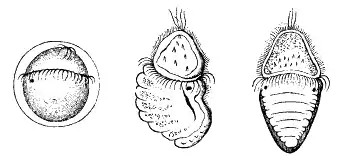 Larvae of chitons: First image is the trochophore, second is in metamorphosis, third is an immature adult.