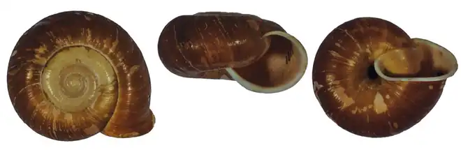 Apical, apertural and umbilical view of the shell of the holotype of Chloritis balatensis. The width of the shell is 41 mm.