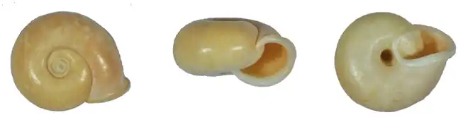The shell is solid, unicolored light ochre, biconcave, irregularly striated according to some growth lines, with numerous hair pits covering the whole surface.[1] The spire is deeply sunken.[1] The shell has 334-412 whorls.[1] Whorls are rounded, first whorls very narrow, the last one very large, and partly embracing the preceding one, distinctly descending in front.[1] The umbilicus is deep, and about 1/8 of the width of the shell.[1] The aperture is crescent, a little oblique, peristome thick and expanded all around and is somewhat reflexed; both ends connected by a quite thin callus.[1] The width of the shell is 17.1-19.9 mm.[1] The height of the shell is 9.5-11.7 mm.[1]