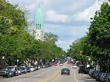 ![]() Christophe Colomb Avenue, seen northbound, with the tower of Église St-Arsène. | |