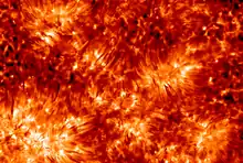 The density of the Sun's chromosphere decreases exponentially with distance from the center of the Sun by a factor of roughly 10 million, from about 2×10−4 kg/m3 at the chromosphere's inner boundary to under 1.6×10−11 kg/m3 at the outer boundary.[5] The temperature initially decreases from the inner boundary at about 6000 K[6] to a minimum of approximately 3800 K,[7] but then increasing to upwards of 35,000 K[6] at the outer boundary with the transition layer of the corona (see Stellar corona § Coronal heating problem).