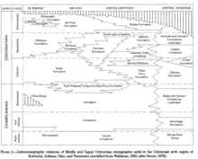 The Cincinnati Arch contains three distinct stages: the Edenain, Maysvillian, and the Richmondian.[3] The Edenian stage is the oldest stage of the three. The Edenian contains these formations: Kope, Clays Ferry, Garrard Siltstone, Catheys, Inman, Fairview, and Leipers Limestone.[3] The Maysvillian is the second oldest stage containing these formations: Dillsboro, Kope, Bellevue, Fairview, Grant Lake Limestone, Ashlock, Calloway Creek, Leipers, Fernvale, and Arnheim.[3] The most recent stage is the Richmondian. The Richmondian contains: Bull Fork, Saluda, Whitewater, Drakes and parts of Grant Lake Limestone as well as Fernvale and Arnheim. Formations can be a part of only one stage or in multiple stages depending on how old they are. Formations can also be represented in multiple states depending on how far they reach.