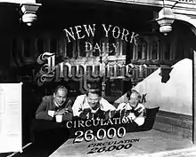 The early footage was called "Orson Welles Tests" on all paperwork.[19]: 69 The first "test" shot was the News on the March projection room scene, economically filmed in a real studio projection room in darkness that masked many actors who appeared in other roles later in the film.[19]: 69 [21]: 77–78 [lower-alpha 6] "At $809 Orson did run substantially beyond the test budget of $528—to create one of the most famous scenes in movie history," wrote Barton Whaley.[25]: 107