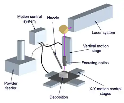 A laser is used to melt metallic powder dropped on a substrate to be coated. The melted metal forms a pool on the substrate; moving the substrate allows the melt pool to solidify in a track of solid metal. Some processes involve moving the laser and powder nozzle assembly over a stationary substrate to produce solidified tracks. The motion of the substrate is guided by a CAM system which interpolates solid objects into a set of tracks, thus producing the desired part at the end of the trajectory.