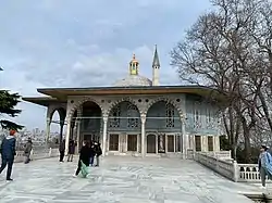 Selim III (r. 1789–1807) was responsible for rebuilding the Eyüp Sultan Mosque between 1798 and 1800.[249][250] This mosque is located next to the tomb of Abu Ayyub al-Ansari, an important Islamic religious site in the area of Istanbul originally built by Mehmed II. The new mosque made use of the classical Ottoman tradition by following the octagonal baldaquin design, similar to the Sokollu Mehmed Pasha Mosque in the Azapkapı neighbourhood, but much of its decoration is in the contemporary Baroque style.[249][251][252]
