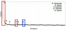 X-ray diffraction pattern of a Nontronite standard purchased from the clay mineral society. Red boxes represent a wide peaks attributed to nontronite. Blue box represents a sharp peak attributed to quartz present in the standard.