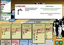 Climate Challenge is a Flash-based global warming game produced by the BBC and developed by Red Redemption. Players manage the economy and resources of the 'European Nations' as its president, while reducing emissions of CO2 to combat climate change and managing crises. Climate Challenge is an environmental serious game, designed to give players an understanding of the science behind climate change, as well as the options available to policy makers and the difficulties in their implementation.[1]