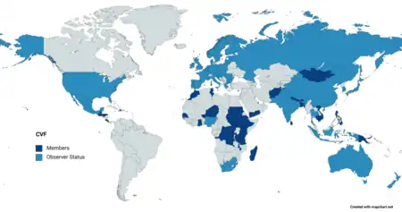 Forty-three governments have participated in the CVF from key developing regions around the world.[25] In 2009, the following countries adopted its first declaration: Bangladesh, Barbados, Bhutan, Ghana, Kenya, Kiribati, Maldives, Nepal, Rwanda, Tanzania, and Vietnam[26] Two years later, the following countries adopted its second declaration: Afghanistan, Bangladesh, Bhutan, Costa Rica, Ethiopia, Ghana, Kenya, Kiribati, Madagascar, Maldives, Nepal, Philippines, Rwanda, Saint Lucia, Tanzania, Timor-Leste, Tuvalu, Vanuatu, and Vietnam.[21]