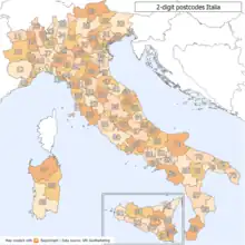 Codice di avviamento postale (Italian for 'Postal Sending Code'; CAP) is the Italian post code numeric system, created in 1967. It consists of five digits: the first two denote the administrative province (sometimes shared by two or more provinces for those that have been split after 1967); the third indicates if the town is the chief town of the province (odd number, usually 1 or 9, e.g. 07100 for Sassari) or not (even, usually 0 or 8, e.g. 10015 for Ivrea); the last two designate the specific town or village, (only in provinces created after 1992) the delivery post office, or, in large cities like Rome, Milan, Naples, or Venice, the urban postal district (usually 00 or 70 in minor provincial chief towns). San Marino and the Vatican City are integrated into the Italian postcode system.