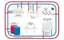 Various heat sources can be used as energy suppliers for the cold heating network, in particular renewable sources such as the ground, water, commercial and industrial waste heat, solar thermal energy and ambient air, which can be used individually or in combination.[1] Due to the generally modular design of cold local heating networks, new heat sources can be gradually developed as the network is further expanded, so that larger heating networks can be fed from a variety of different sources.[4]