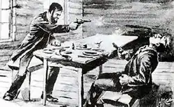 With his family's reputation of violence and betrayal, Vega was an easy prime suspect and soon the townspeople, led by notorious gunfighter and advocate of the settlers Robert Clay Allison, formed a mob to hunt him down. After apprehending Cruz Vega, they tortured and hanged him by a pole. The Vega family mourned Cruz's death, and his uncle Francisco swore to avenge him by killing Allison. On November 1, Griego managed to trap and confront Allison in the saloon of the St. James Hotel. As Griego drew his pistol, Allison drew faster and shot Griego twice in the chest, killing him.[6] Days later, Allison was charged with the murder but after an inquiry, the charge was dropped and the shooting was ruled as self-defense. Allison had also killed another gunman by the name of Chunk Colbert in Colfax County the previous year.[7] Company gang members retaliated by conducting night-time raids on the settlers, destroying their property as well as murdering those who fought back.