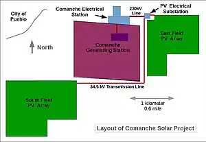 The Comanche Solar Project is a 120 megawatt (MWAC) photovoltaic power station near the city of Pueblo, Colorado. It became the largest solar facility in the state when it came online in late 2016. The electricity is being sold to Public Service of Colorado, a subsidiary of Xcel Energy, under a 25-year power purchase agreement (PPA). Xcel determined through an open bid process that the PPA's terms were competitive with natural gas.[1][2][3]