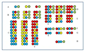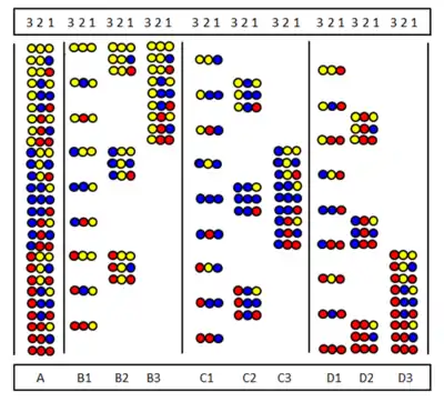Positional scanning was introduced independently by Furka et al.[30] and Pinilla et al.[31] The method is based on the synthesis and testing of series of sublibraries. in which a certain sequence position is occupied by the same amino acid. The figure shows the nine sublibraries (B1-D3) of a full peptide trimer library (A) made from three amino acids. In sublibraries there is a position which is occupied by the same amino acid in all components. In the synthesis of a sublibrary the support is not divided and only one amino acid is coupled to the whole sample. As a result, one position is really occupied by the same amino acid in all components. For example, in the B2 sublibrary position 2 is occupied by the "yellow" amino acid in all the nine components. If in a screening test this sublibrary gives positive answer it means that position 2 in the active peptide is also occupied by the "yellow" amino acid. The amino acid sequence can be determined by testing all the nine (or sometime less) sublibraries.