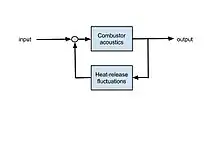 The simplest example of a thermoacoustic combustion instability is perhaps that happening in a horizontal Rijke tube (see also thermoacoustics): Consider the flow through a horizontal tube open at both ends, in which a flat flame sits at a distance of one-quarter the tube length from the leftmost end. In a similar way to an organ pipe, acoustic waves travel up and down the tube producing a particular pattern of standing waves. Such a pattern also forms in actual combustors, but takes a more complex form.[9] The acoustic waves perturb the flame. In turn, the flame affects the acoustics. This feedback between the acoustic waves in the combustor and the heat-release fluctuations from the flame is a hallmark of thermoacoustic combustion instabilities. It is typically represented with a block diagram (see figure). Under some conditions, the perturbations will grow and then saturate, producing a particular noise. In fact, it is said that the flame of a Rijke tube sings.