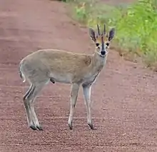 The common duiker (Sylvicapra grimmia), also known as the gray duiker or bush duiker, is a small antelope and the only member of the genus Sylvicapra. This species is found everywhere in Africa south of the Sahara, excluding the Horn of Africa and the rainforests of the central and western parts of the continent. Generally, they are found in habitats with sufficient vegetation cover to allow them to hide—savannah and hilly areas, including the fringes of human settlements.[2]