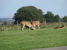 Females are sexually mature at 15 to 36 months and males at 4 to 5 years. Mating may occur anytime after reaching sexual maturity, but is mostly seen in the rainy season. In Zambia, young are born in July and August, while elsewhere this is the mating season.[21] Mating begins when elands gather to feed on lush, green plains with plentiful grass, and some males and females start mating with each other in separate pairs. Males chase the females to find out if they are in estrus. They also test the female's urine. Usually, a female chooses the most dominant and fit male to mate with. Sometimes, she runs away from males trying to mate, causing more attraction. This results in fights between males, in which their hard horns are used. A female allows a male to mount after two to four hours. Males usually keep close contact with females in the mating period.[24] The dominant male can mate with more than one female.[21] Females have a gestation period of nine months, and give birth to only one calf each time.[30]